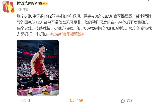 其次,這一場張寧自己打的不好,第二節(jié)過早身背3犯讓自己處于被動;最后也是最關(guān)鍵的原因,40分鐘賽制+FIBA尺度下,張寧被削弱了,不妨來看看媒體人付政浩的看法: